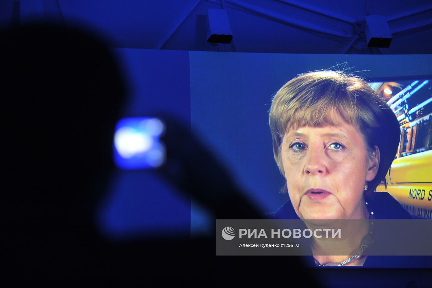 Канцлер Германии Ангела Меркель во время телемоста на церемонии пуска в эксплуатацию второй ветки газопровода "Северный поток" на компрессорной станции "Портовая" в Выборге.