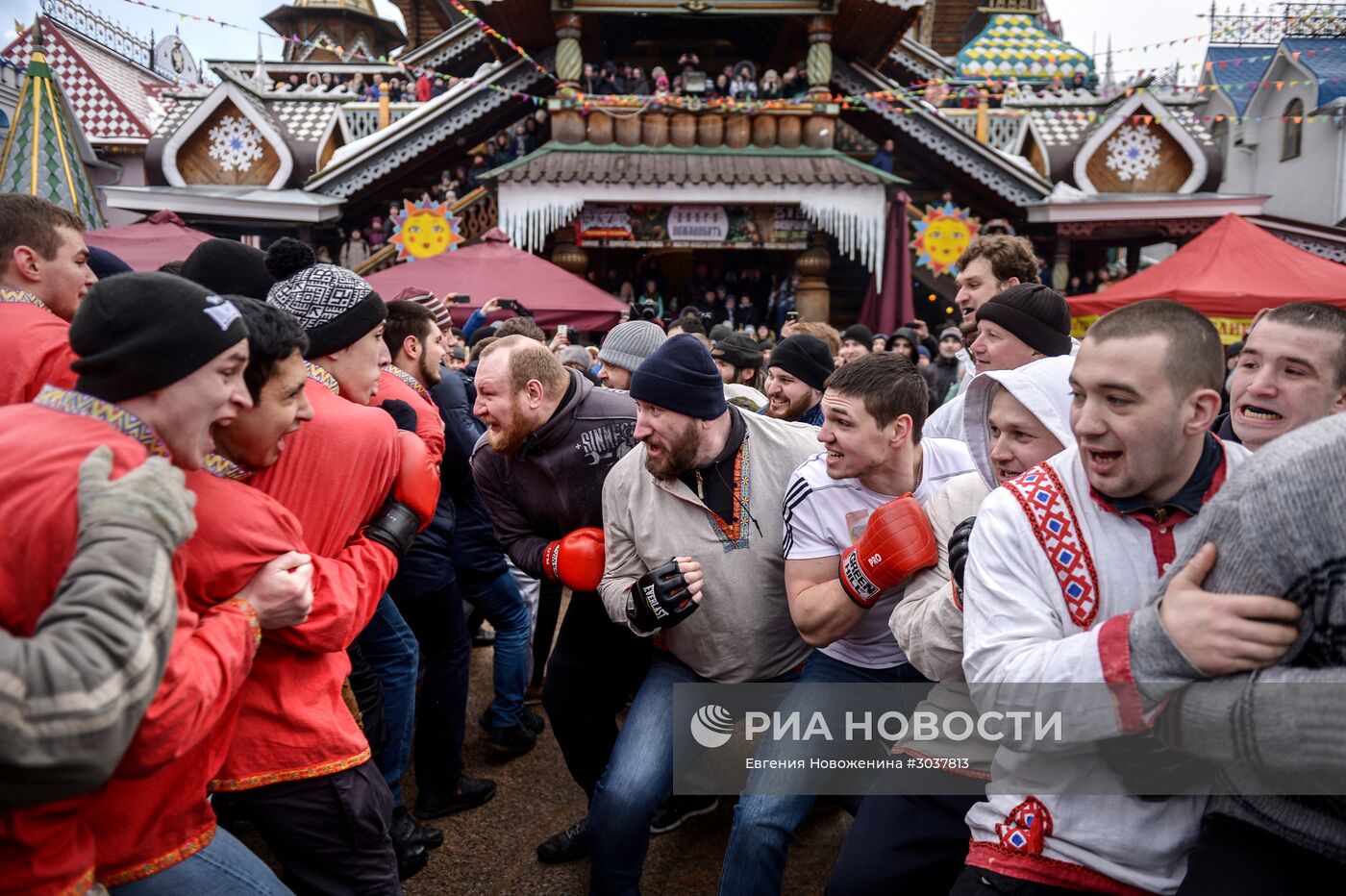 Участники кулачных боев "стенка на стенку" во время празднования Масленицы в Центре русской культуры "Кремль в Измайлово".