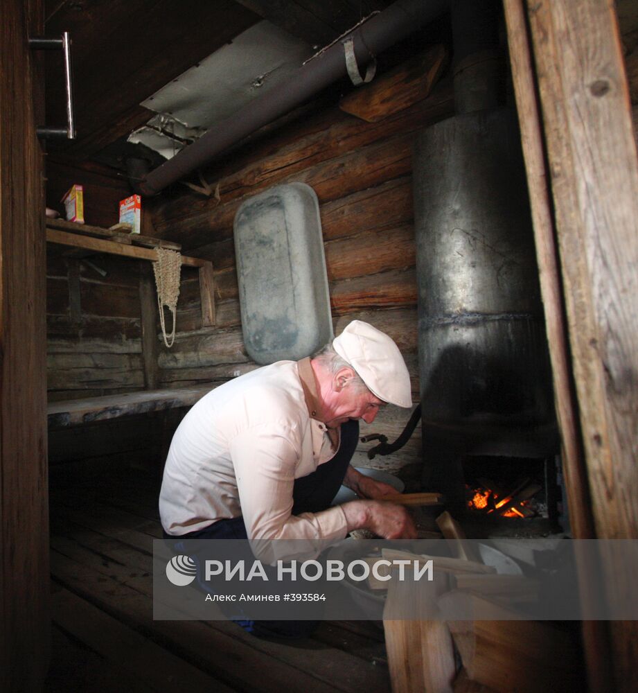 Дачник растапливает деревенскую баню на приусадебном участке во Владимирской области.