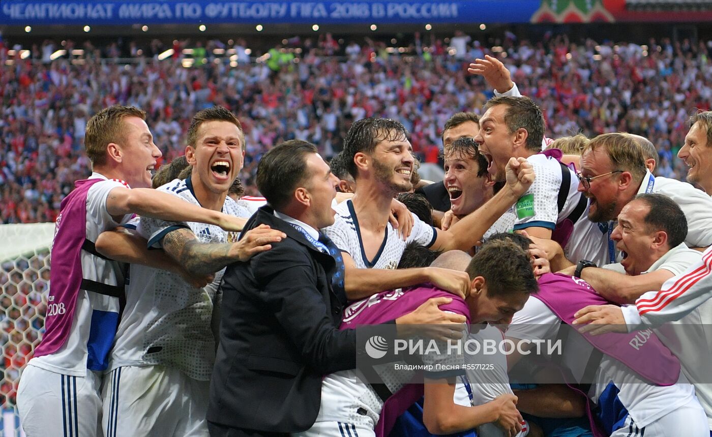 Игроки сборной России радуются победе в матче 1/8 финала чемпионата мира по футболу между сборными Испании и России.