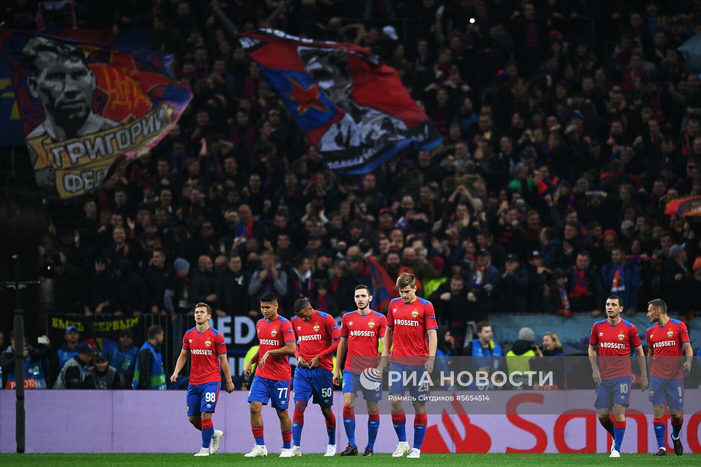 Игроки ПФК ЦСКА Иван Обляков, Ильзат Ахметов, Родриго Бекао, Никита Чернов, Яка Бийол, Алан Дзагоев и Федор Чалов (слева направо) в матче группового этапа Лиги чемпионов УЕФА между ПФК ЦСКА (Россия, Москва) и ФК "Реал" (Испания, Мадрид).