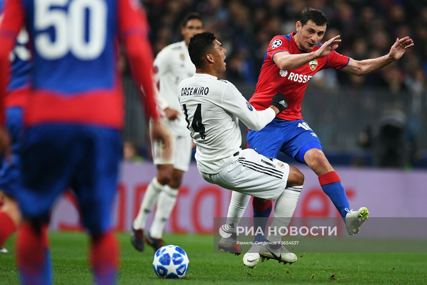 Игрок ПФК ЦСКА Алан Дзагоев, игрок ФК "Реал" Каземиро (справа налево) в матче группового этапа Лиги чемпионов УЕФА между ПФК ЦСКА (Россия, Москва) и ФК "Реал" (Испания, Мадрид).