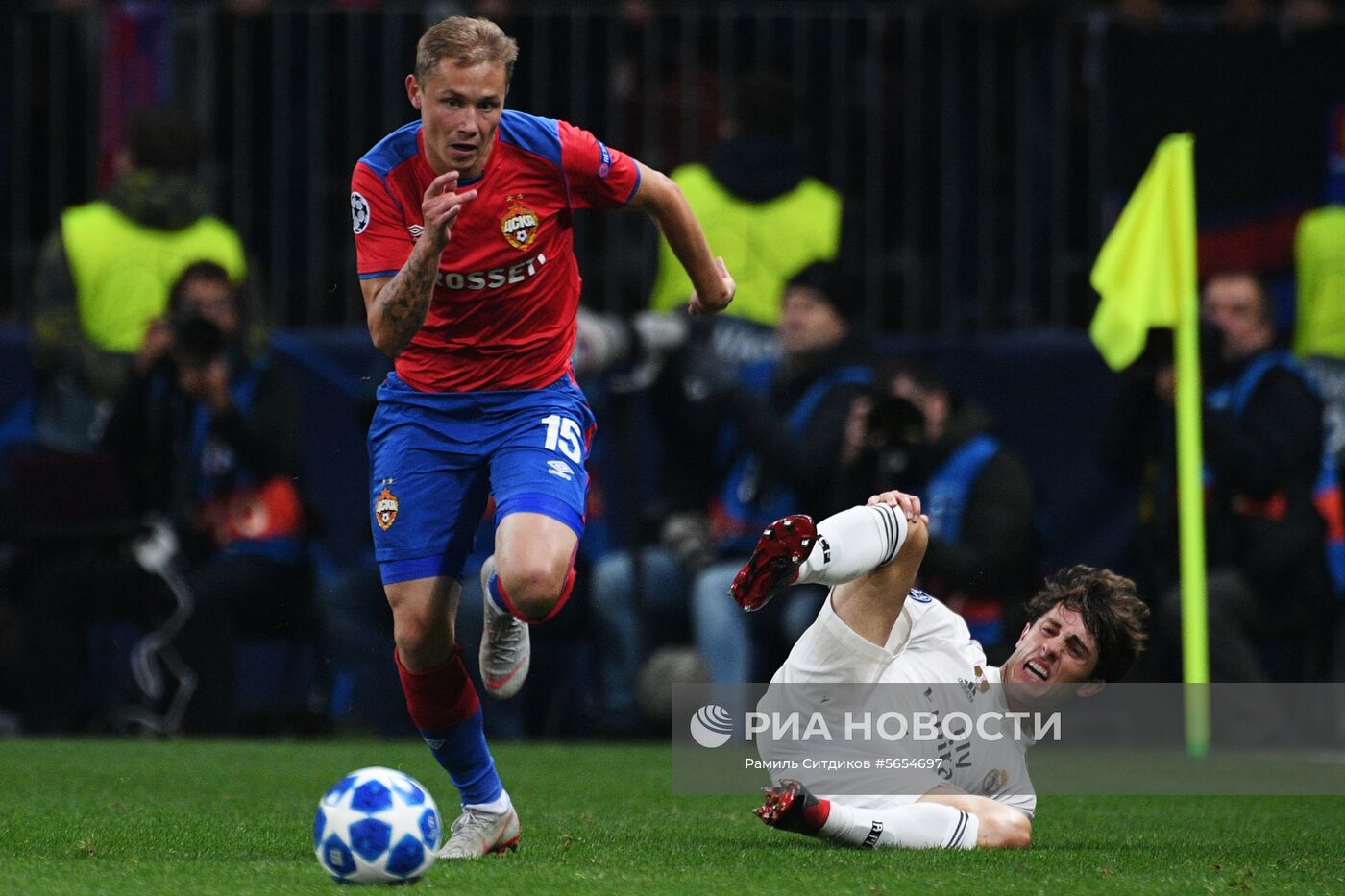 Игрок ПФК ЦСКА Дмитрий Ефремов (слева) в матче группового этапа Лиги чемпионов УЕФА между ПФК ЦСКА (Россия, Москва) и ФК "Реал" (Испания, Мадрид).