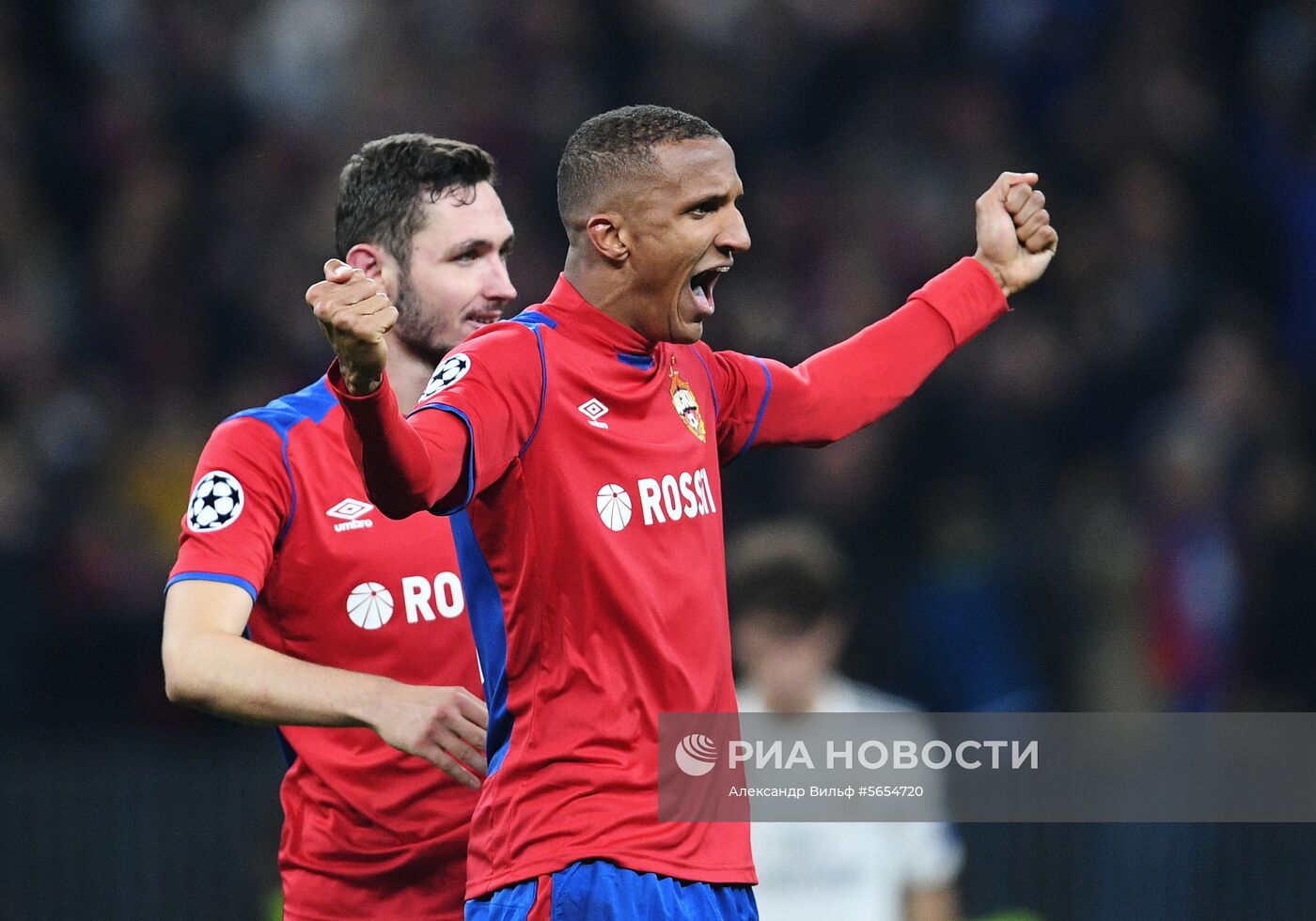 Игроки ПФК ЦСКА Родриго Бекао (Справа) и Никита Чернов радуются победе в матче группового этапа Лиги чемпионов УЕФА между ПФК ЦСКА (Россия, Москва) и ФК "Реал" (Испания, Мадрид).