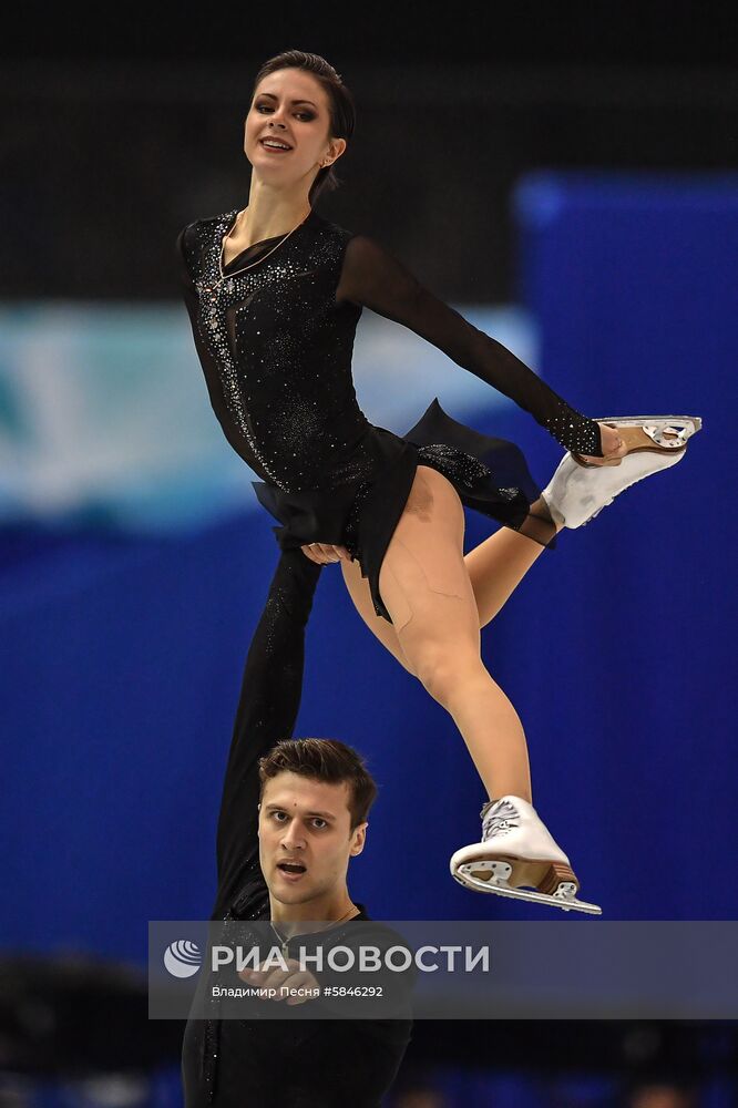 Наталья Забияко и Александр Энберт (Россия) выступают в произвольной программе парного катания на командном чемпионате мира по фигурному катанию в Фукуоке.