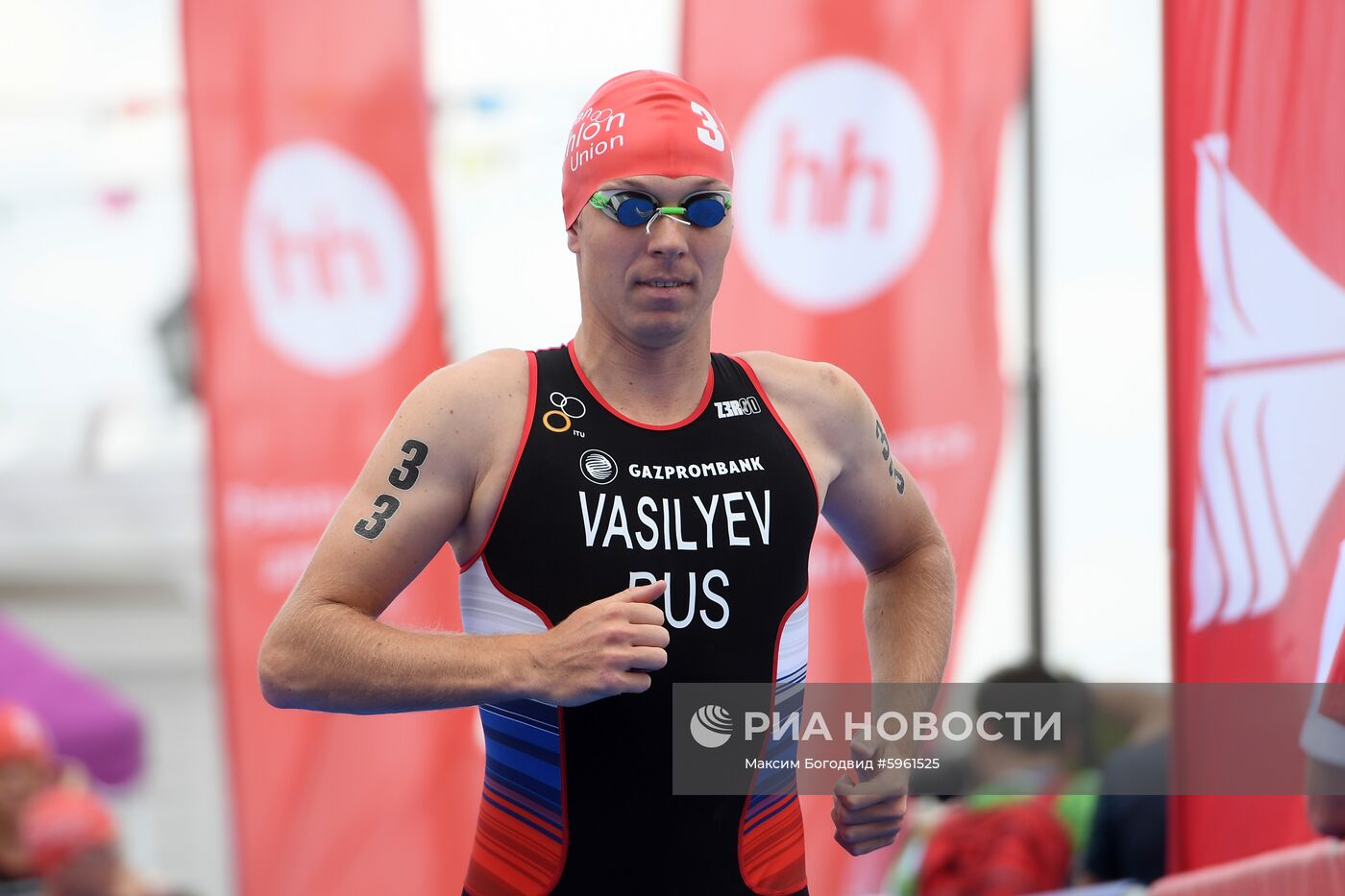 Денис Васильев (Россия) на старте спринта на 750 м в плавании в личном первенстве среди мужчин на соревнованиях по триатлону на Чемпионате Европы в Казани.