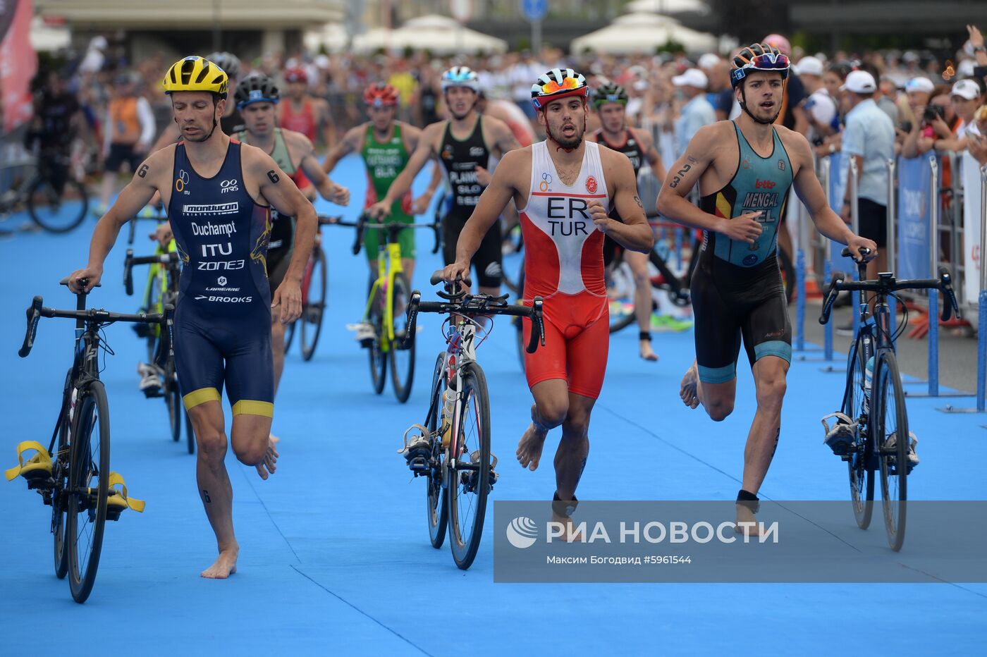 Спортсмены на дистанции - спринта в велогонке среди мужчин на соревнованиях по триатлону на Чемпионате Европы в Казани.