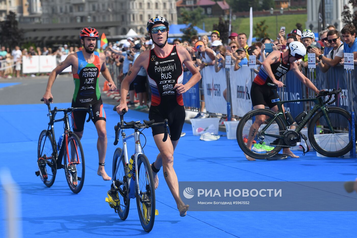 Дмитрий Полянский (Россия) на дистанции - спринта в велогонке среди мужчин на соревнованиях по триатлону на Чемпионате Европы в Казани.