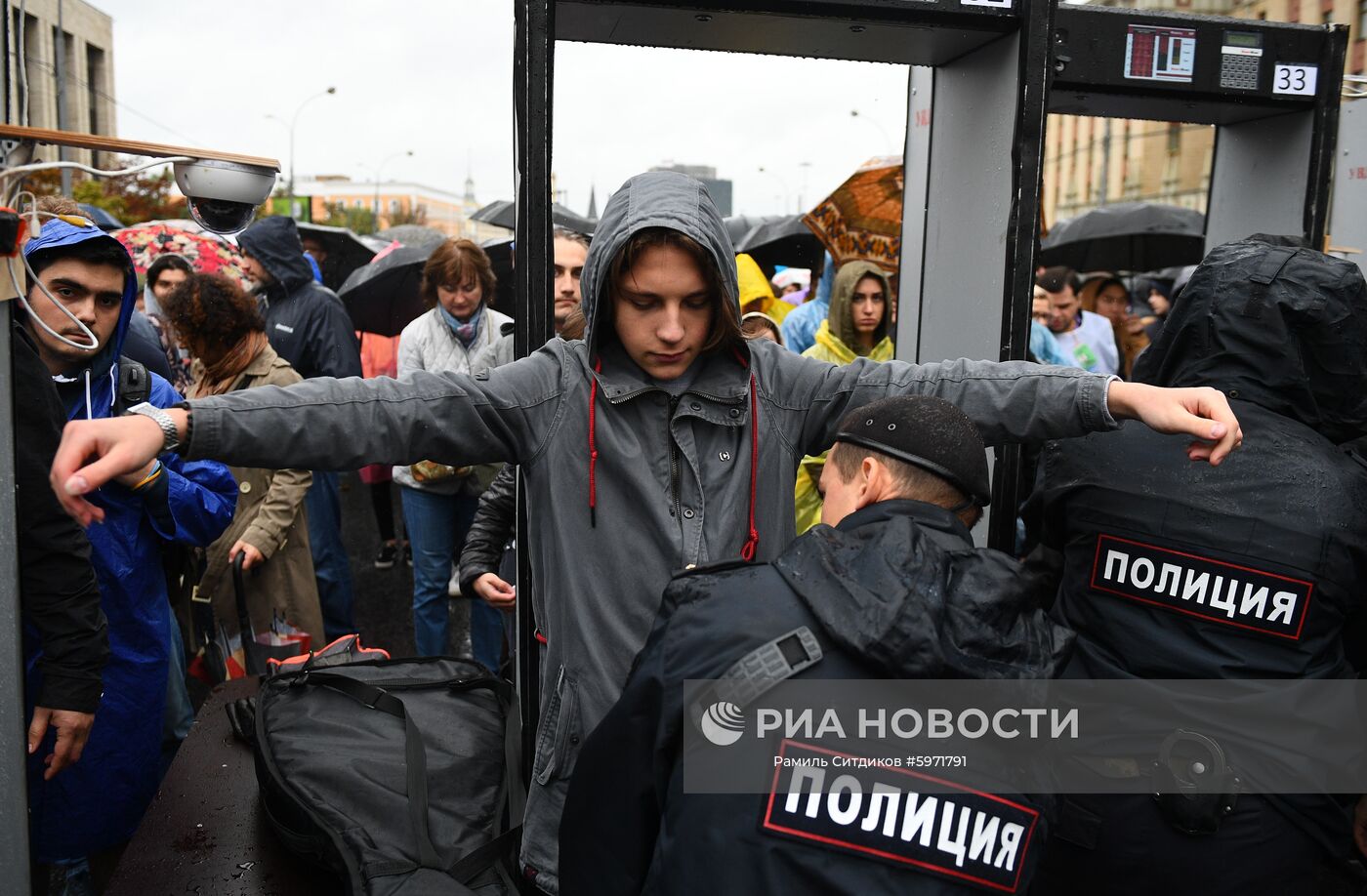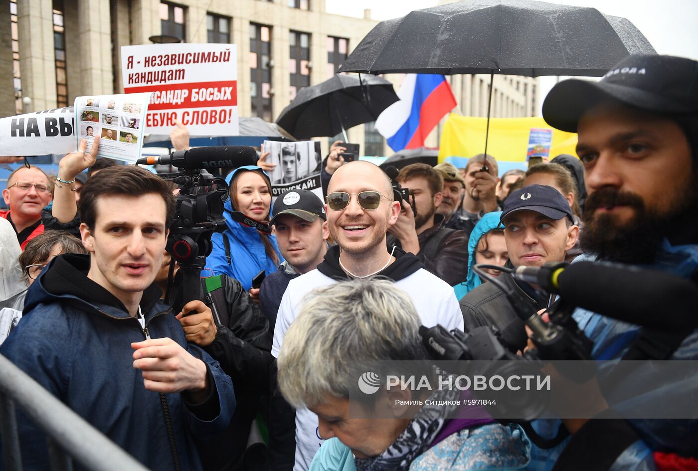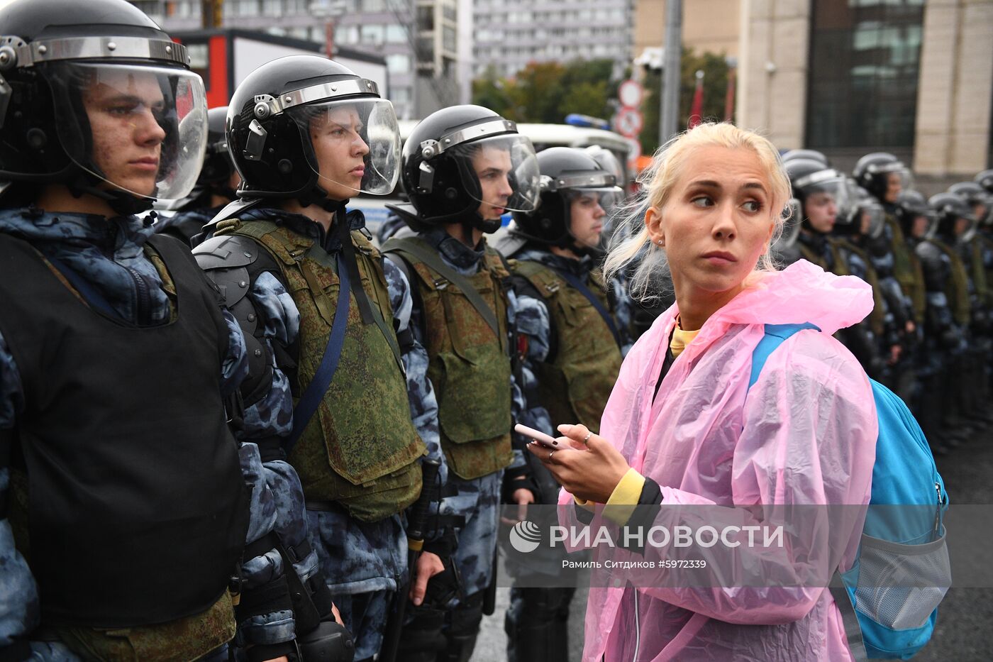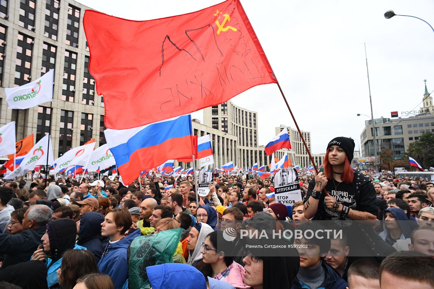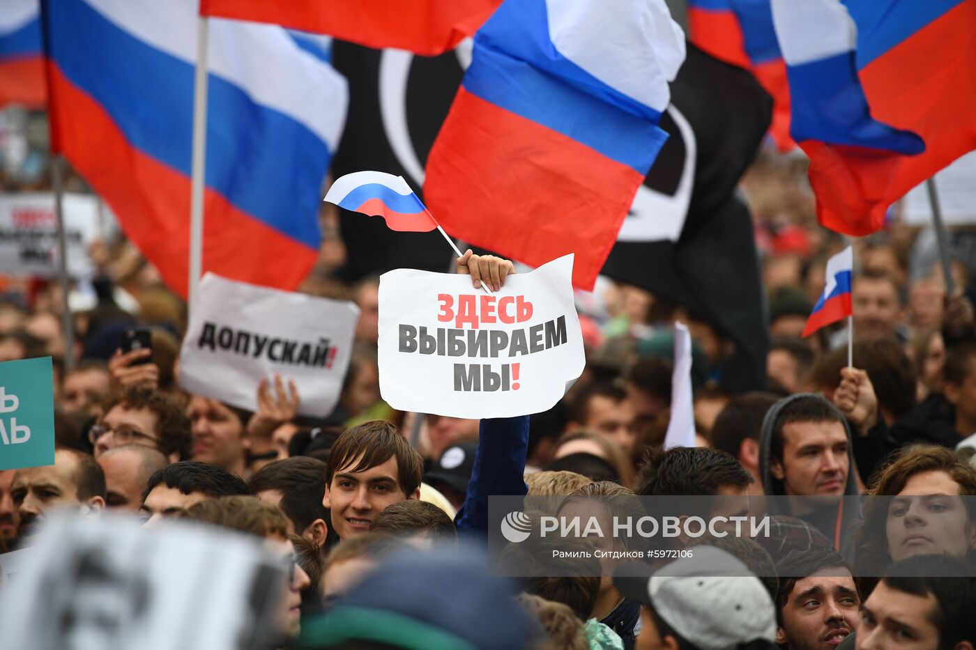 Участники митинга в поддержку незарегистрированных кандидатов в Мосгордуму на проспекте Академика Сахарова в Москве.