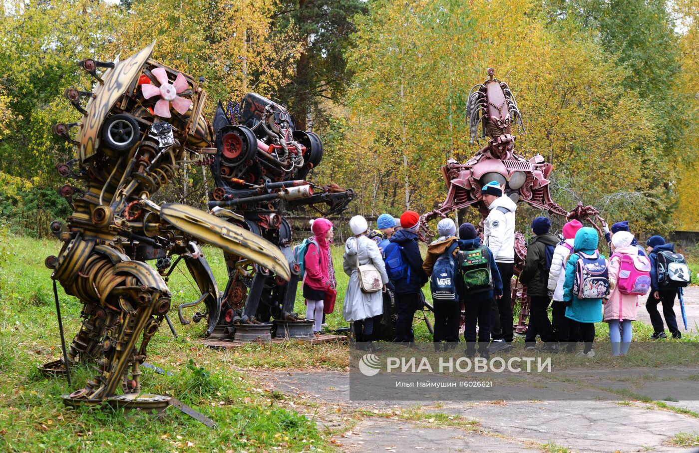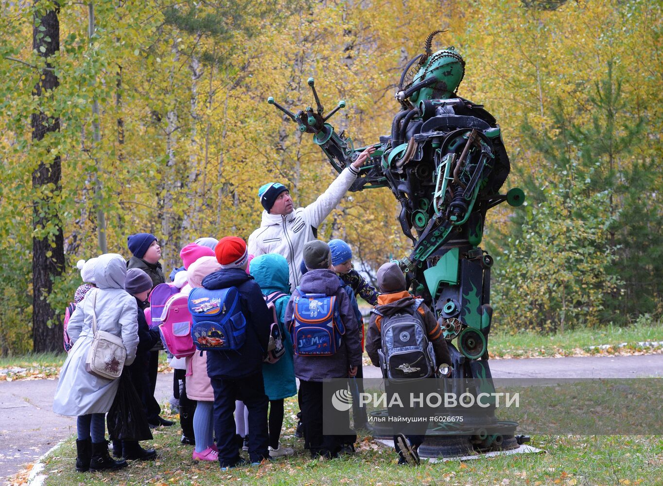 Автослесарь Сергей Кулагин готовит к выставке свои работы из отслуживших автомобильных деталей в парке на территории школы № 9 в Дивногорске.