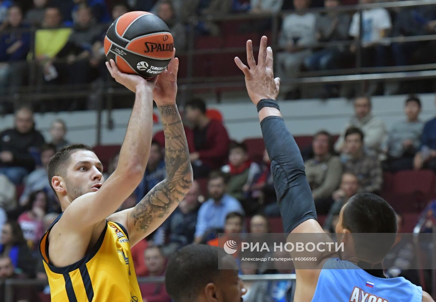 Игрок "Химок" Стефан Йович (слева) и игрок "Зенита" Густаво Айон в матче 7-го тура регулярного чемпионата мужской баскетбольной Евролиги сезона 2019/2020 между БК "Зенит" (Санкт-Петербург, Россия) и БК "Химки" (Химки, Россия).