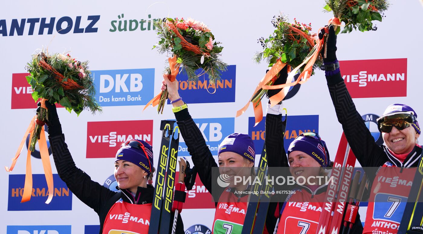 Вита Семеренко, Юлия Джима, Анастасия Меркушина и Елена Пидгрушная (Украина), занявшие 3-е место в эстафете среди женщин на чемпионате мира по биатлону в итальянской Антерсельве.