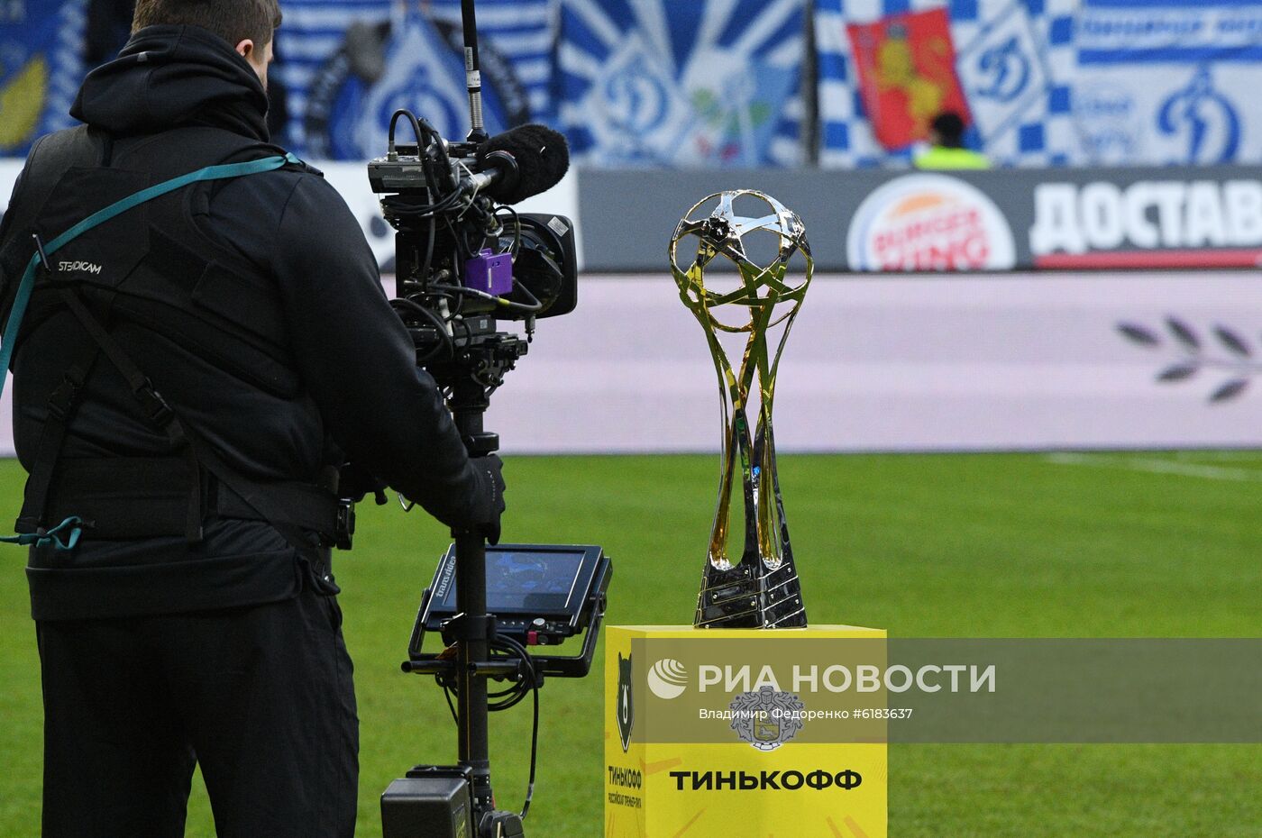 Оператор ведет съемку перед началом матча 20-го тура чемпионата России по футболу среди клубов Премьер-лиги между ФК "Динамо" (Москва) и ФК "Спартак" (Москва). В центре: награда чемпионата.