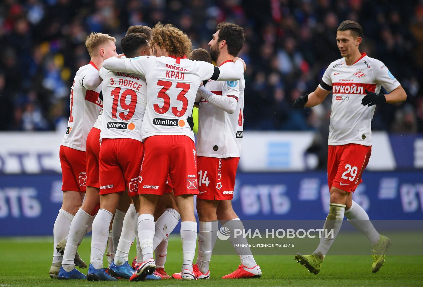 Игроки ФК "Спартак" радуются забитому мячу в матче 20-го тура чемпионата России по футболу среди клубов Премьер-лиги между ФК "Динамо" (Москва) и ФК "Спартак" (Москва).