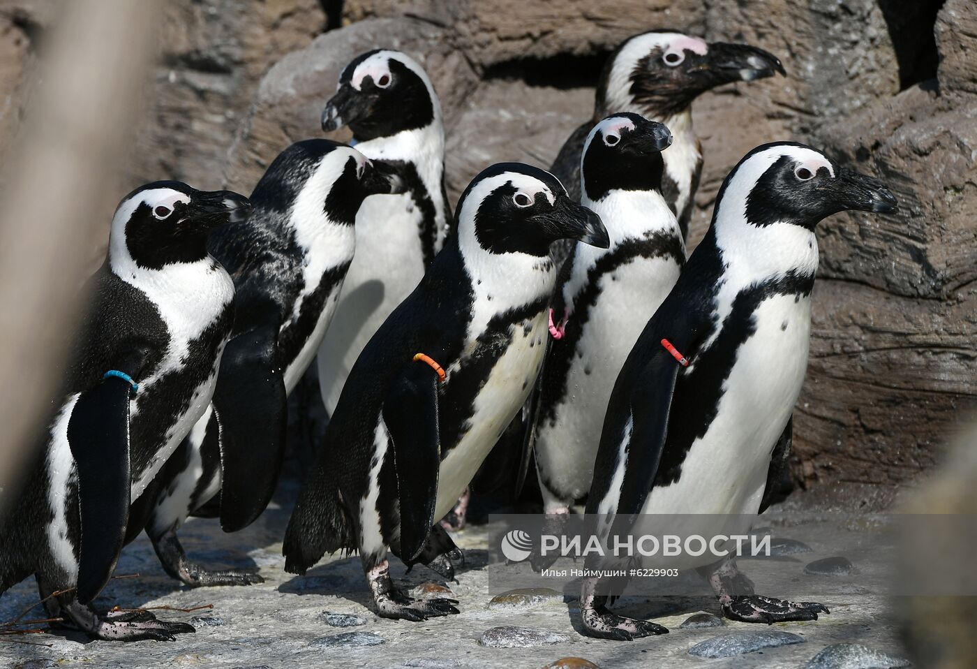 Очковые пингвины в парке флоры и фауны "Роев ручей" в Красноярске. 27 апреля в парке проводится акарицидная обработка от клещей.