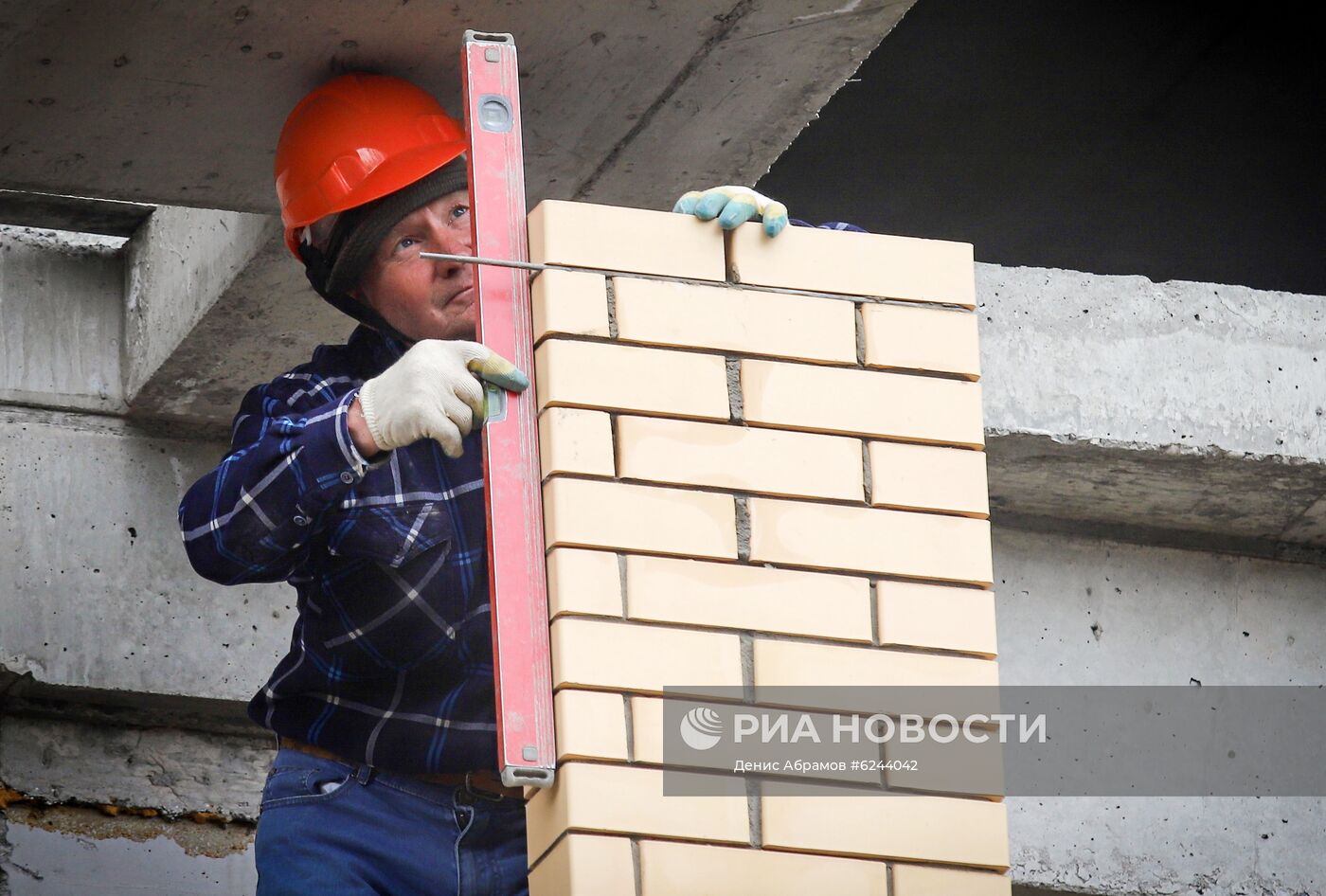 Рабочий во время строительства многоквартирного жилого дома после снятия карантина в Пятигорске.