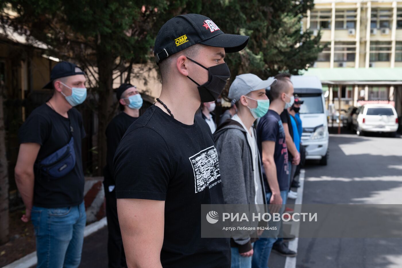 Призывники перед посадкой в автобус на сборном пункте военного комиссариата в Сочи.