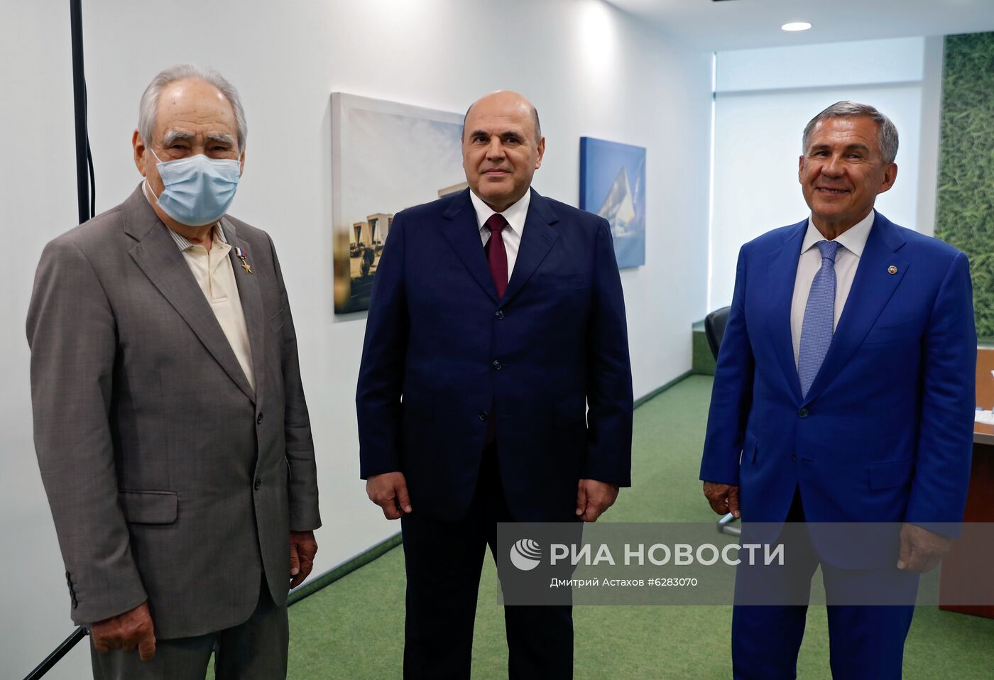 9 июля 2020. Председатель правительства РФ Михаил Мишустин, президент Республики Татарстан Рустам Минниханов (справа) и и государственный советник президента Республики Татарстан Минтимер Шаймиев (слева) во время встречи.