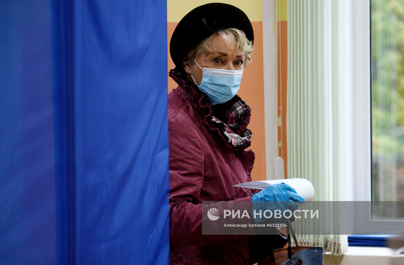Женщина во время досрочного голосования на выборах губернатора Иркутской области на избирательном участке в Иркутске.