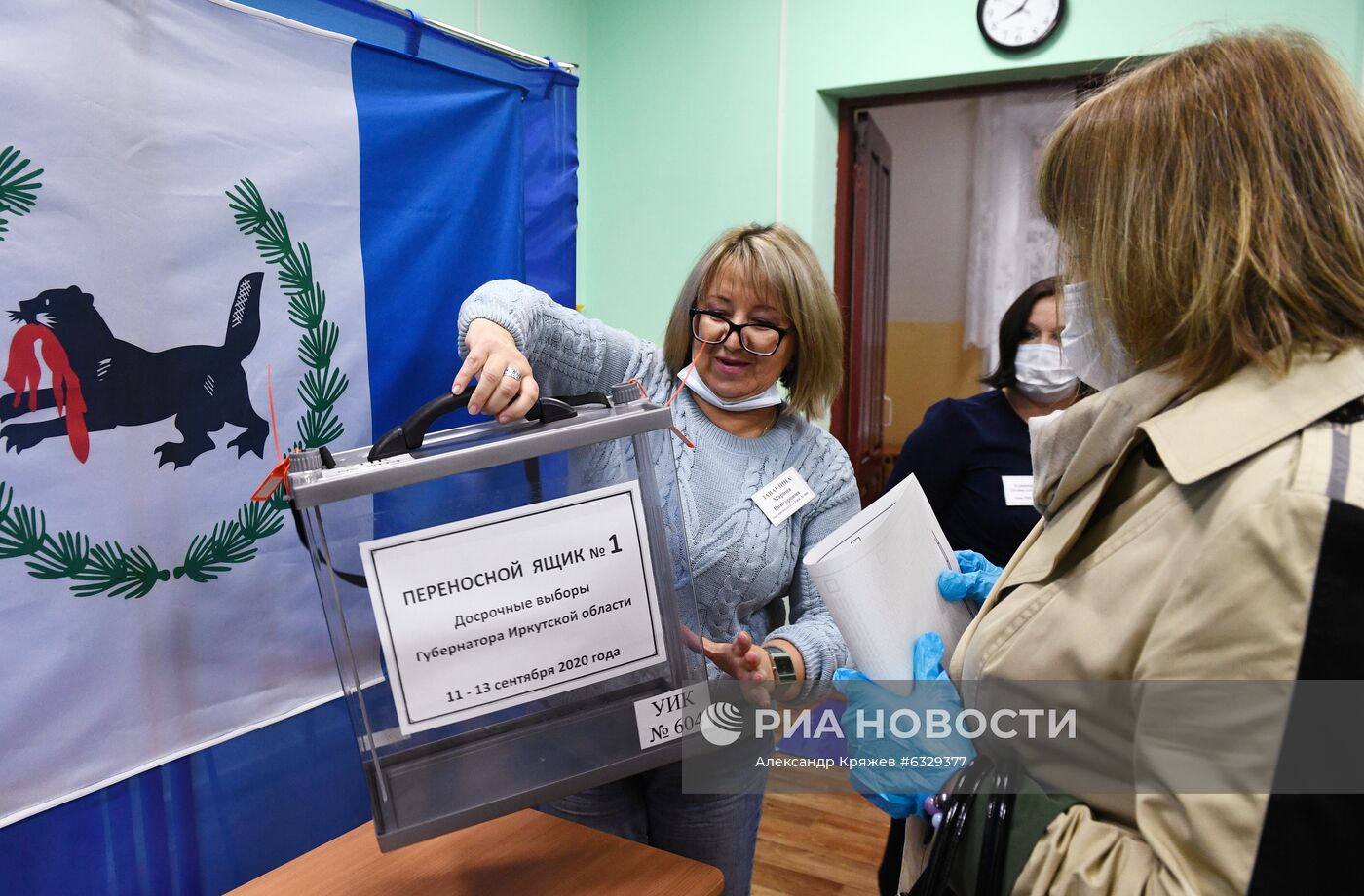 Члены участковой избирательной комиссии перед открытием участка для досрочного голосования по выборам губернатора Иркутской области на избирательном участке №604 в Иркутске.