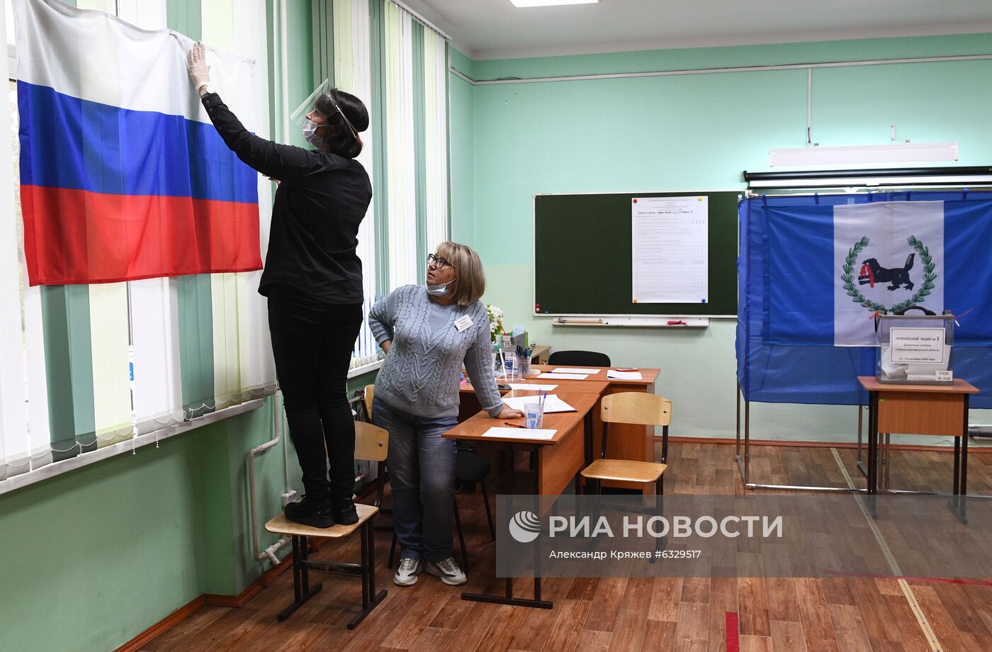 Подготовка избирательного участка к досрочному голосованию на выборах губернатора Иркутской области на избирательном участке в Иркутске.
