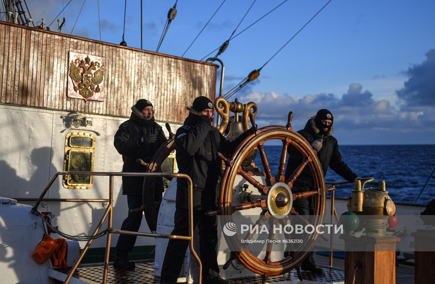 Курсанты-практиканты у штурвала на парусном судне "Седов" в Карском море. Во время перехода до Мурманска на "Седове" морскую практику прошли 136 курсантов Мурманского государственного технического университета, Балтийской академии рыбопромыслового флота и Калининградского морского рыбопромышленного колледжа. После Мурманска "Седов" возьмет курс на порт приписки Калининград.