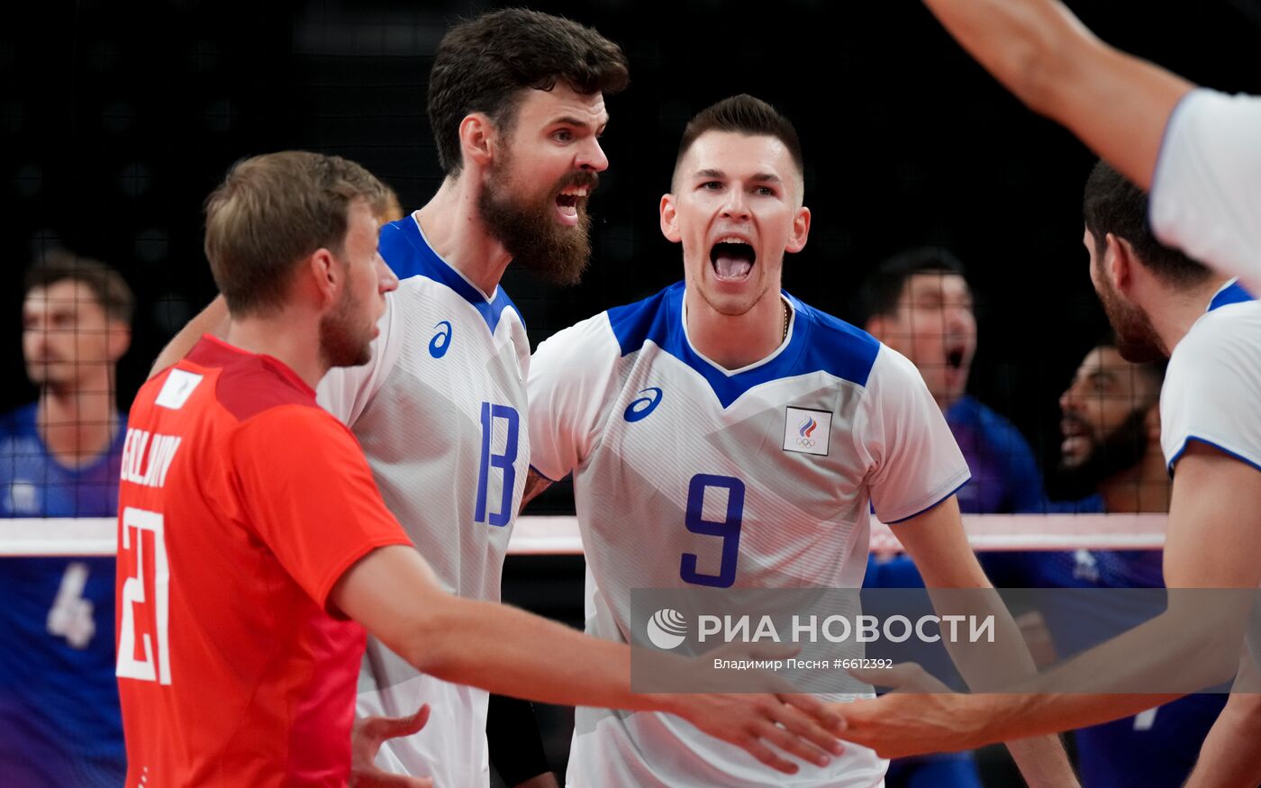 Николя Ле Гофф и Ясин Луати (Франция) в матче группового этапа соревнований по волейболу среди мужчин между сборными Франции и Олимпийского комитета России (командой ОКР) на XXXII Олимпийских играх в Токио.