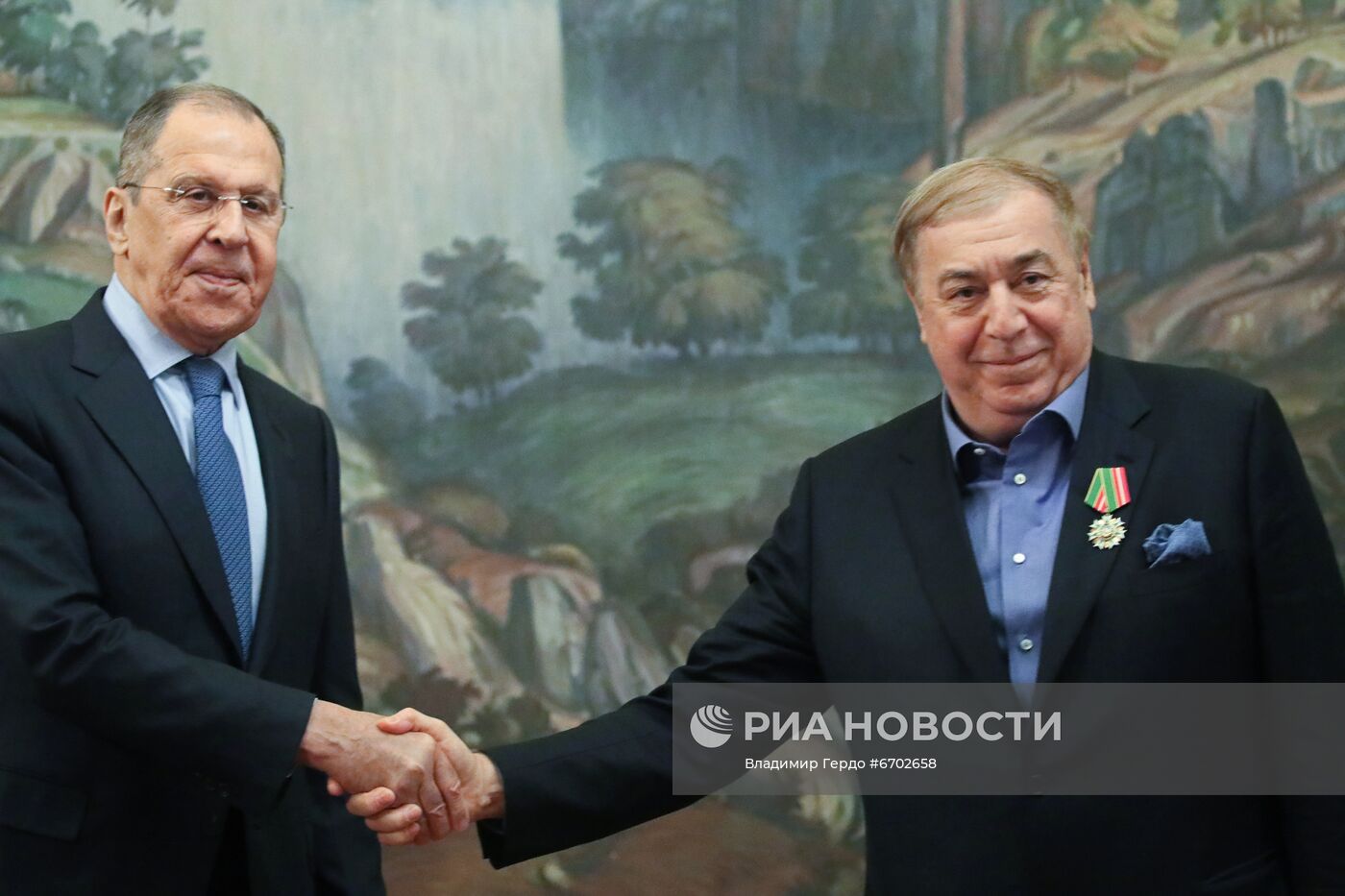 Министр иностранных дел РФ Сергей Лавров (слева) вручил награду МИД РФ "За вклад в международное сотрудничество" предпринимателю Михаилу Гуцериеву после форума "Международная повестка российского бизнеса: вызовы, риски, стратегия взаимодействия с государством".