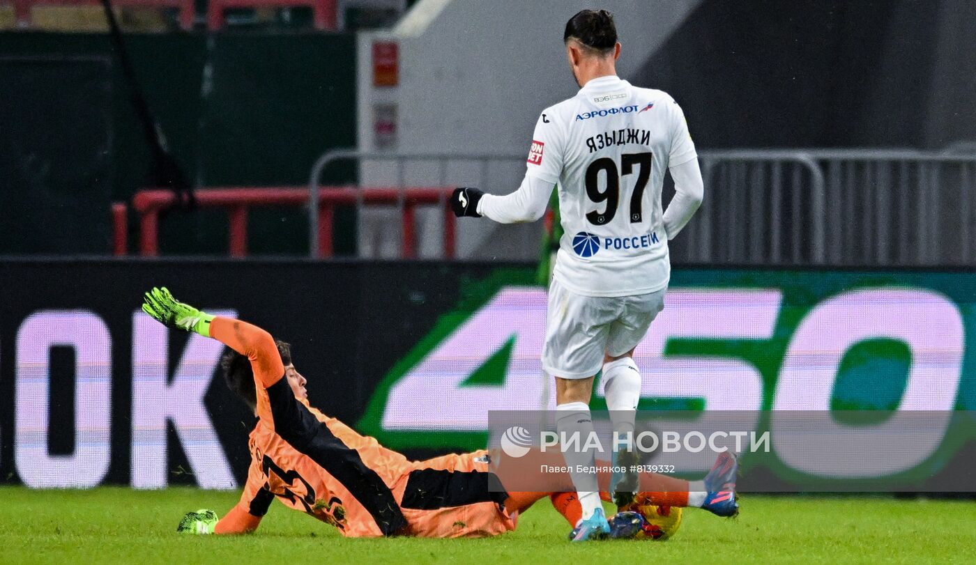 Вратарь "Локомотива" Даниил Худяков (слева) и игрок ЦСКА Юсуф Языджи в матче 21-го тура чемпионата России по футболу среди клубов Премьер-лиги между командами ФК "Локомотив" (Москва) и ПФК ЦСКА (Москва).