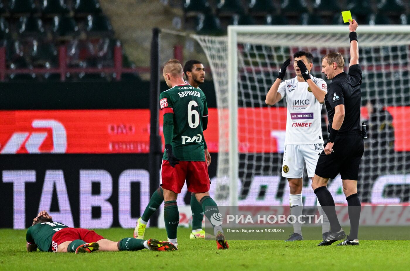 Главный судья Сергей Иванов показывает желтую карточку игроку ЦСКА Бактиёру Зайнутдинову в матче 21-го тура чемпионата России по футболу среди клубов Премьер-лиги между командами ФК "Локомотив" (Москва) и ПФК ЦСКА (Москва).