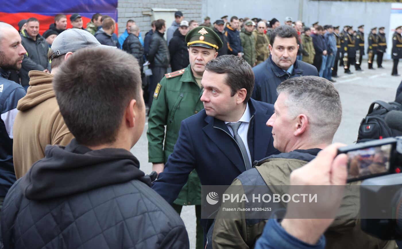 Губернатор Мурманской области Андрей Чибис (в центре) провожает мужчин, призванных на военную службу в ходе частичной мобилизации, на территории временного пункта мобилизации в Мурманске. 21 сентября президент РФ Владимир Путин подписал указ о проведении в стране частичной мобилизации.