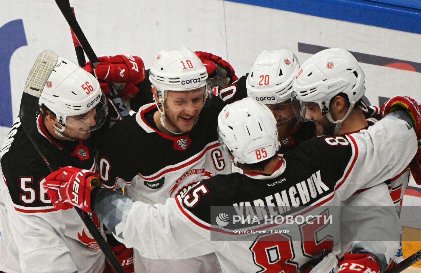Игроки ХК "Витязь" радуются заброшенной шайбе в матче регулярного чемпионата Континентальной хоккейной лиги между ПХК ЦСКА (Россия, Москва) и ХК "Витязь" (Россия, Московская область).
