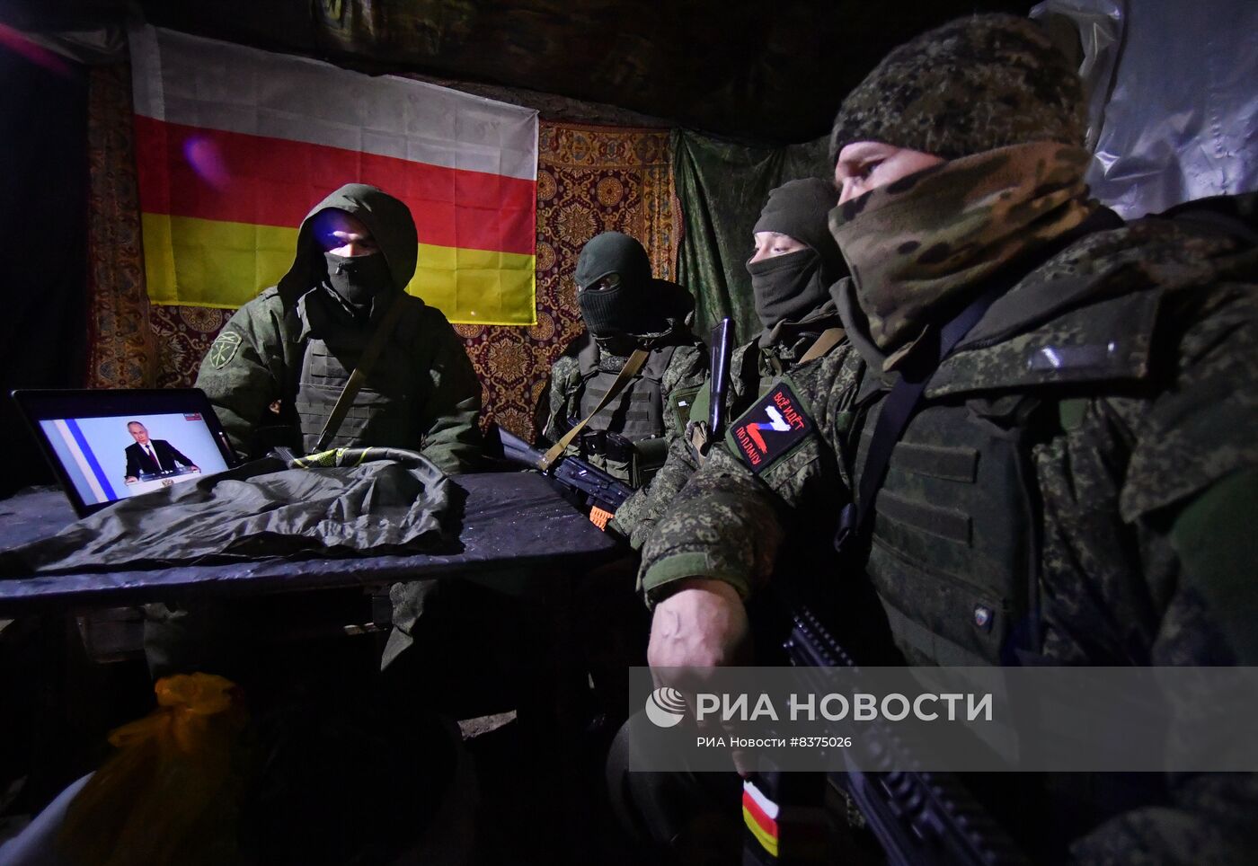 Военнослужащие войск радиационной, химической и биологической защиты (РХБЗ) ЮВО смотрят трансляцию ежегодного послания президента РФ Владимира Путина к Федеральному собранию на ноутбуке, на позиции в южном секторе СВО.