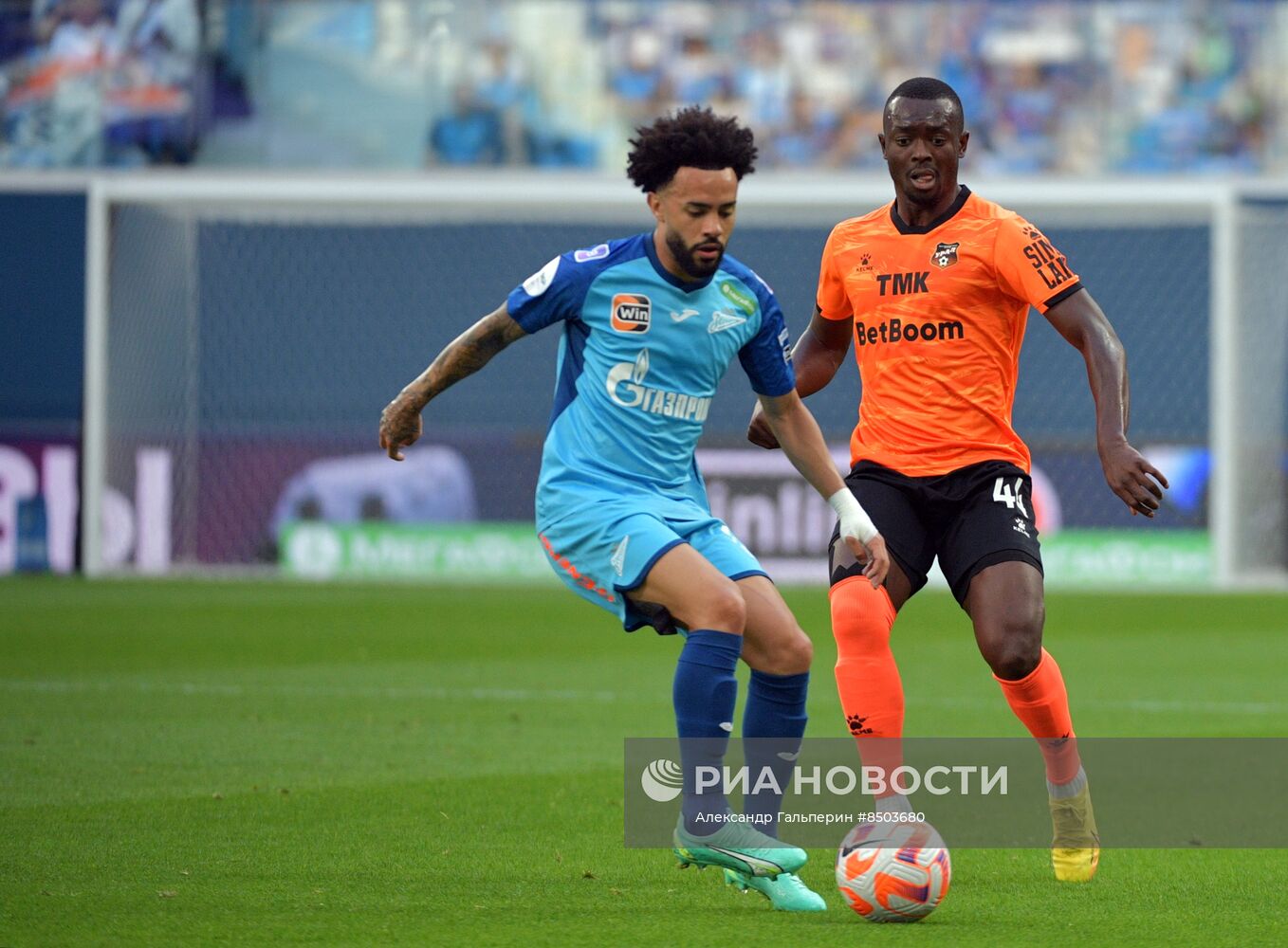 Игрок ФК "Зенит" Клаудиньо и игрок ФК "Урал" Ибраима Сиссе (справа) в матче 6-го тура чемпионата России по футболу среди клубов Премьер-лиги между командами ФК "Зенит" (Санкт-Петербург) и ФК "Урал" (Екатеринбург).