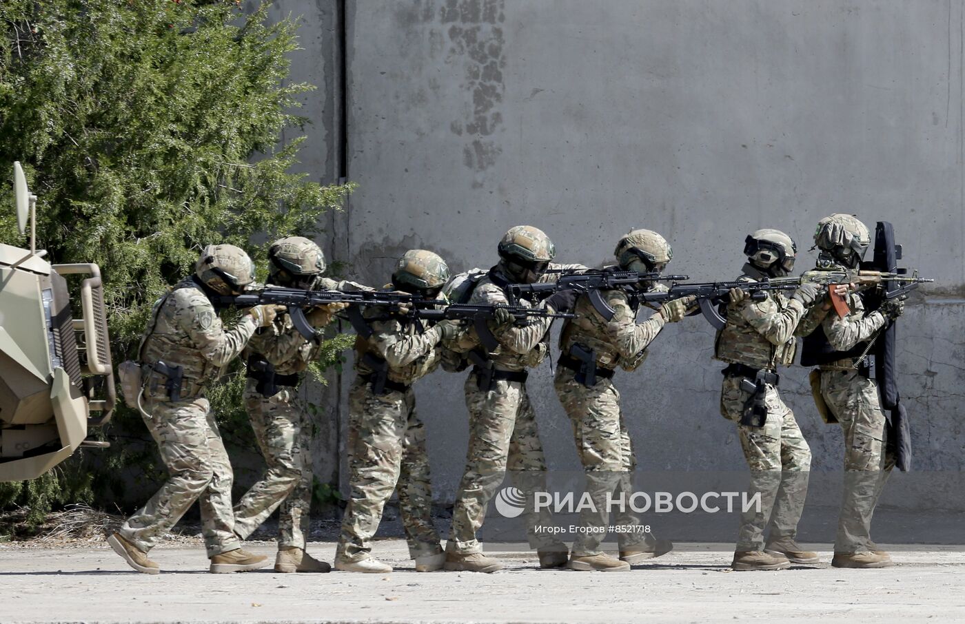 Военнослужащие во время первых совместных антитеррористических учений Содружества Независимых Государств (СНГ) и Шанхайской организации сотрудничества (ШОС) "Евразия-Антитеррор - 2023" в Бишкеке. Учения проходят в рамках первой конференции стран-участниц СНГ по борьбе с терроризмом и экстремизмом.