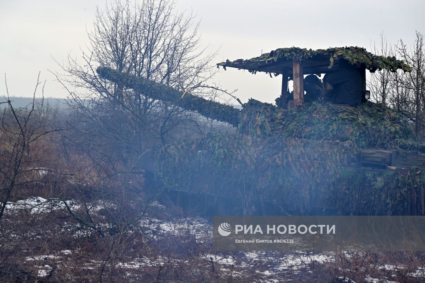 Танк Т-62 2-го армейского корпуса группировки войск "Юг" выдвигается на огневой рубеж для нанесения удара по позициям ВСУ на Северском направлении.