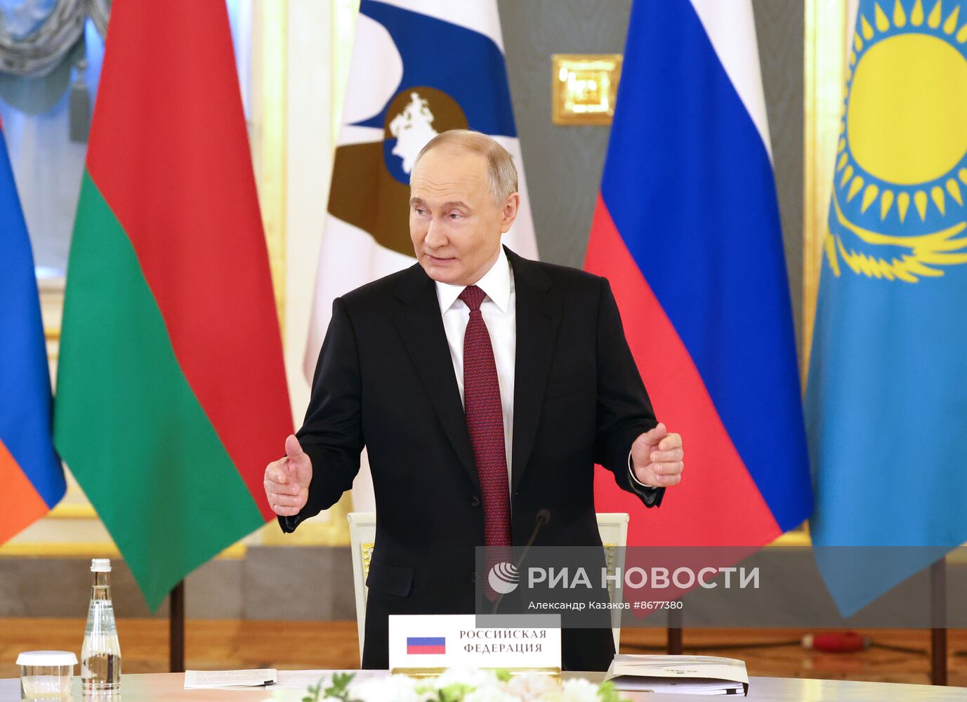 8 мая 2024. Президент РФ Владимир Путин на юбилейном заседании Высшего Евразийского экономического совета (ВЕЭС) на саммите стран - участниц Евразийского экономического союза (ЕАЭС) в Москве. Заседание приурочено к десятилетию со дня подписания Договора о Евразийском экономическом союзе.
