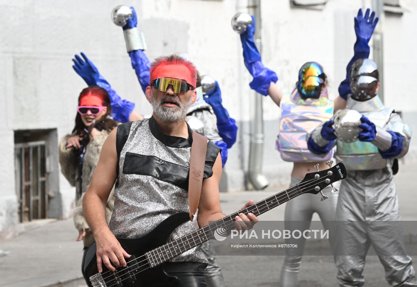 Уличное театральное шествие на Арбате в преддверии церемонии награждения лауреатов ХХХ Российской национальной театральной премии "Золотая маска" в Государственном академическом театре имени Евгения Вахтангова в Москве.