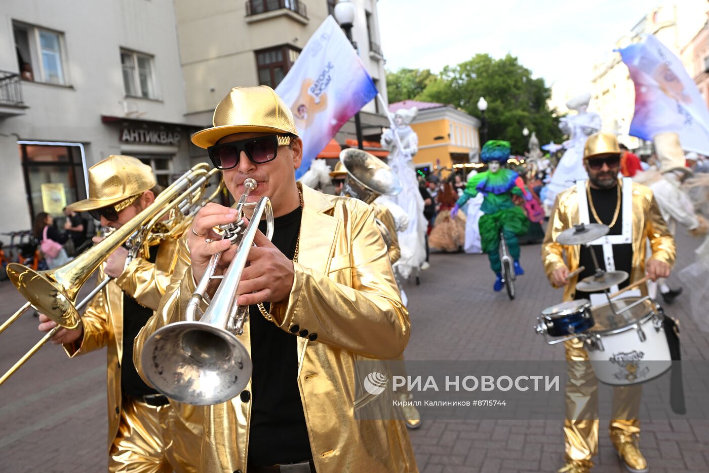 Уличное театральное шествие на Арбате в преддверии церемонии награждения лауреатов ХХХ Российской национальной театральной премии "Золотая маска" в Государственном академическом театре имени Евгения Вахтангова в Москве.