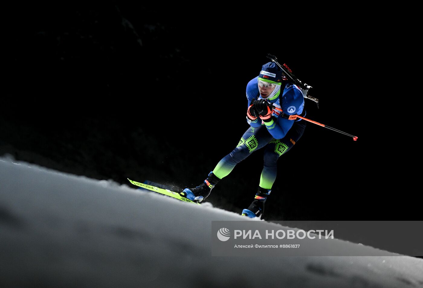 Антон Смольский (Белоруссия) на дистанции индивидуальной гонки на 15 км среди мужчин Кубка сильнейших по биатлону в деревне Раубичи.