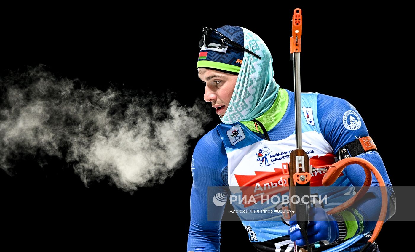 Дмитрий Лазовский (Белоруссия) во время пристрелки перед началом индивидуальной гонки на 15 км среди мужчин Кубка сильнейших по биатлону в деревне Раубичи.