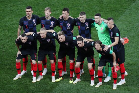 Игроки сборной Хорватии перед Марцело Брозович, Домагой Вида, Иван Ракитич, Шиме Врсалько, Лука Модрич (слева направо на первом плане), Деян Ловрен, Иван Стринич, Марио Манджукич, Анте Ребич, Вратарь Даниел Субашич, Иван Перишич (слева направо на втором плане) началом полуфинального матча чемпионата мира по футболу между сборными Хорватии и Англии.11.07.2018#5586712