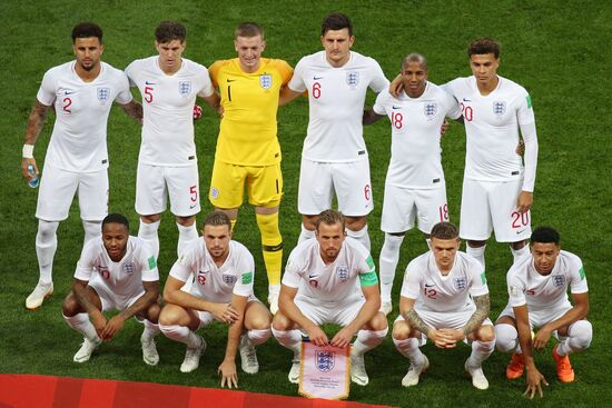 Игроки сборной Англии Рахим Стерлинг, Джордан Хендерсон, Харри Кейн, Киран Триппьер, Джесси Лингард (слева направо на первом плане), Кайл Уокер, Джон Стоунз, вратарь Джордан Пикфорд, Харри Магуайр, Эшли Янг, Деле Алли (слева направо на втором плане) перед началом полуфинального матча чемпионата мира по футболу между сборными Хорватии и Англии.11.07.2018#5586724