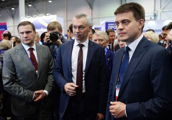Заместитель губернатора Новосибирской области Андрей Жуков, временно исполняющий обязанности губернатора Новосибирской области Андрей Травников и министр науки и высшего образования РФ Михаил Котюков (слева направо) осматривают экспозицию Международной выставки технологического развития «Технопром-2018» в МВК "Новосибирск экспоцентр".27.08.2018#5618628