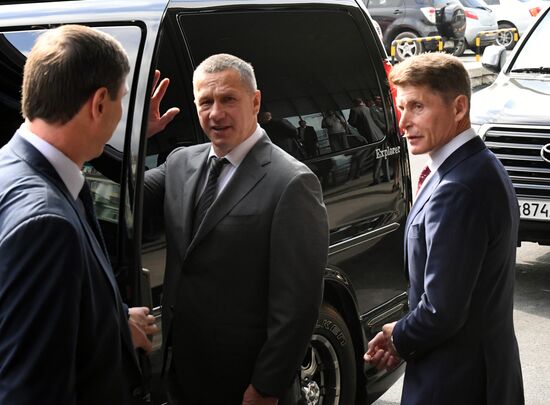 Заместитель председателя правительства РФ - полномочный представитель президента РФ в Дальневосточном федеральном округе (ДФО) Юрий Трутнев и новый временно исполняющий обязанности губернатора Приморского края Олег Кожемяко (слева направо на первом плане) после церемонии представления администрации Приморья.28.09.2018#5649085