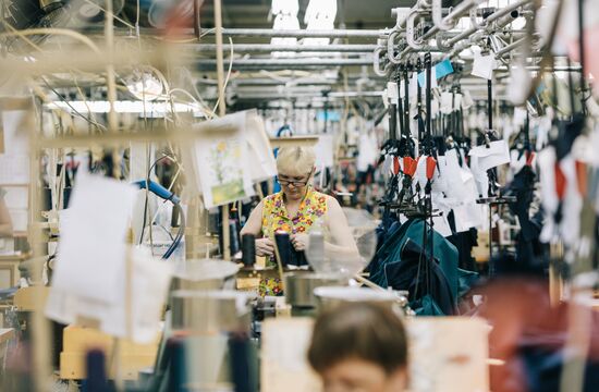 Сотрудница цеха расчерчивания лекал швейной фабрики "Айвенго" в Иваново. Российская швейная фирма "Айвенго" с 1942 года производит швейную продукцию, основным направлением которой являются мужские костюмы. Фабрика занимается производством и продажей оптом и в розницу мужских костюмов, пиджаков, брюк, а также школьной формы для мальчиков и девочек. В год она выпускает более 200 тысяч костюмов.06.02.2019#5772847