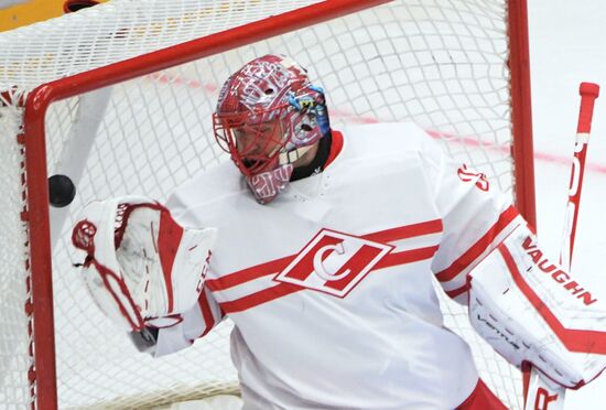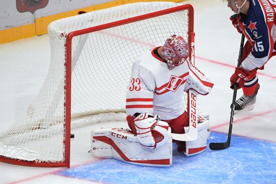 Вратарь ХК "Спартак" Юлиус Гудачек (слева) пропускает шайбу в матче Кубка мэра Москвы между ПХК ЦСКА (Москва) и ХК "Спартак" (Москва).22.08.2019#5981680