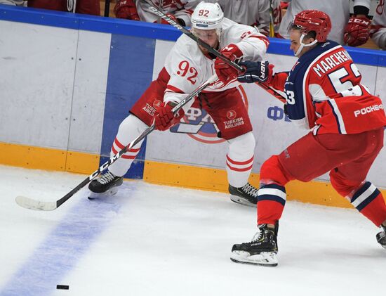 Игрок ХК "Спартак" Антон Злобин (слева) и игрок ПХК ЦСКА Алексей Марченко в матче Кубка мэра Москвы между ПХК ЦСКА (Москва) и ХК "Спартак" (Москва). 22.08.2019#5981941