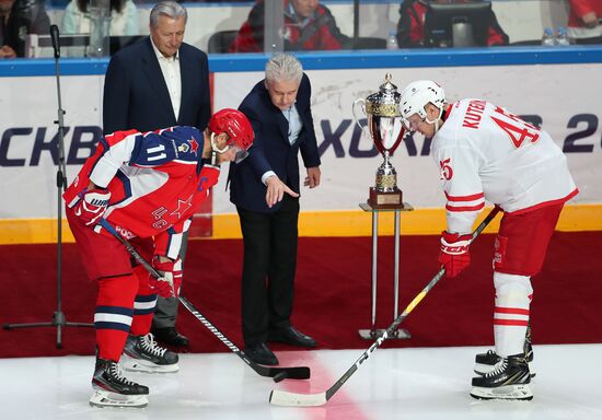 Мэр Москвы Сергей Собянин (в центре) сбрасывает шайбу перед началом матча Кубка мэра Москвы между ПХК ЦСКА (Москва) и ХК "Спартак" (Москва). Слева на втором плане - президент клуба "Легенды хоккея" Александр Якушев.22.08.2019#5981999