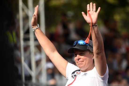 Наталья Авдеева (Россия) радуется победе в полуфинальном матче в индивидуальных соревнованиях по стрельбе из блочного лука среди женщин в финале Кубка мира по стрельбе из лука в Москве. 06.09.2019#6001104